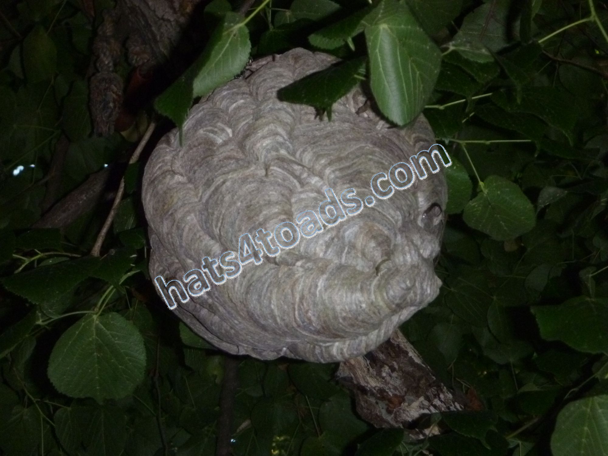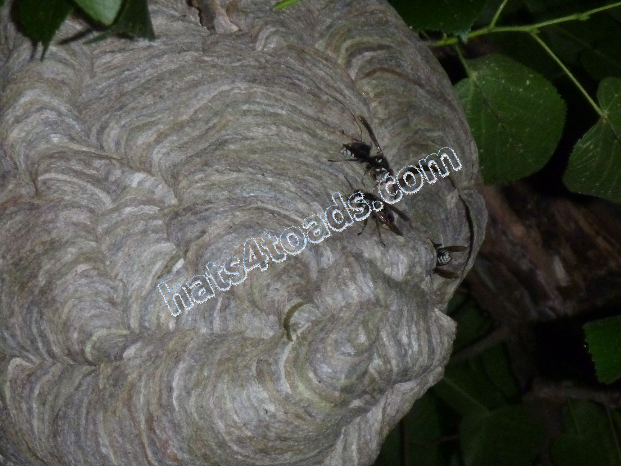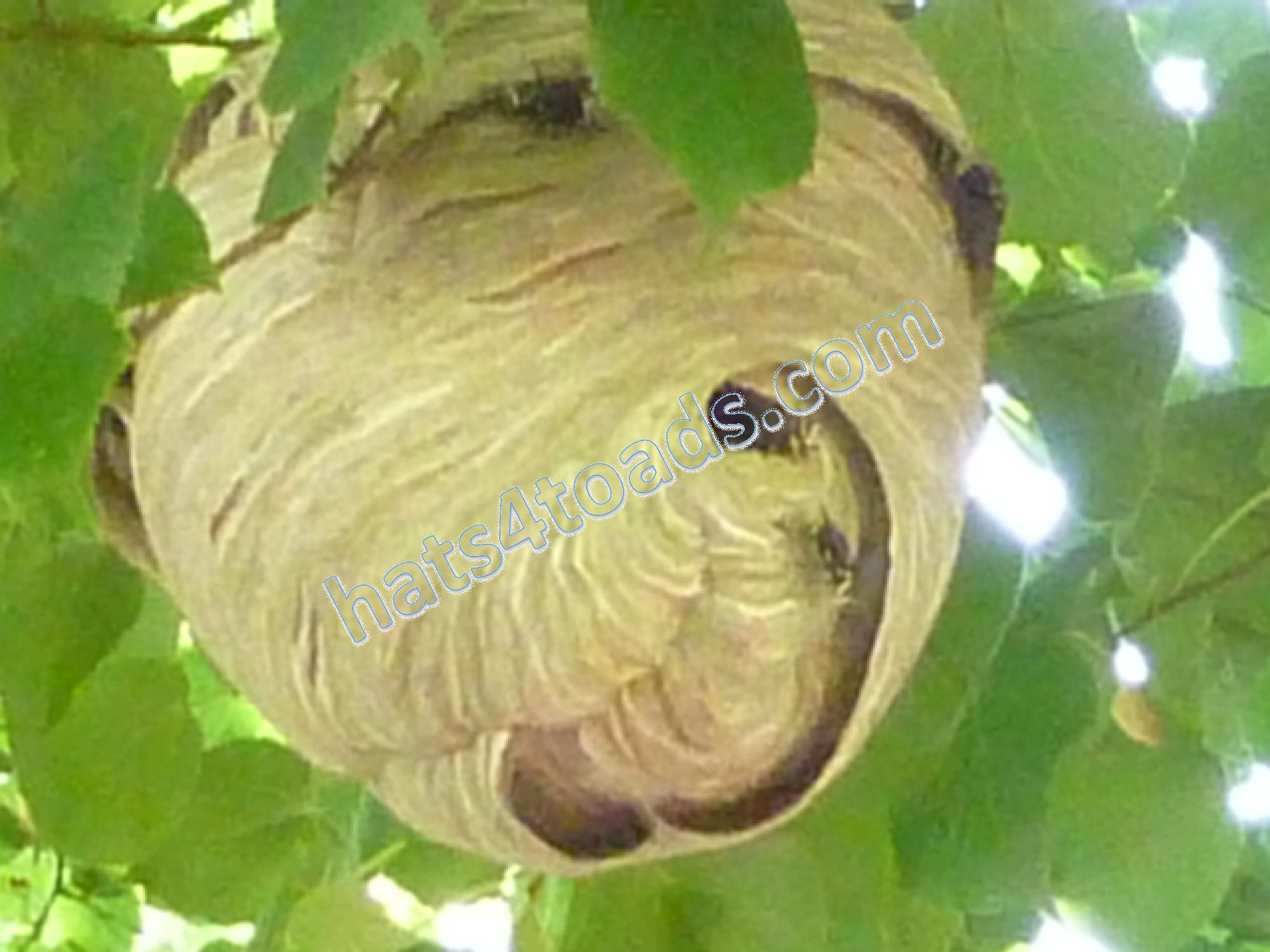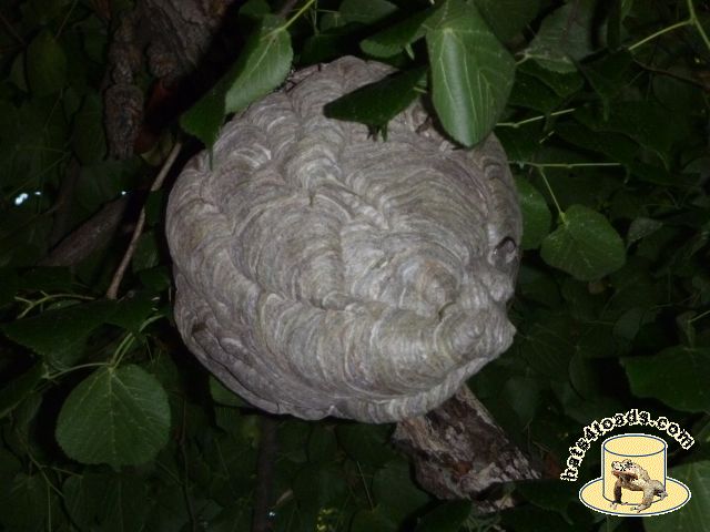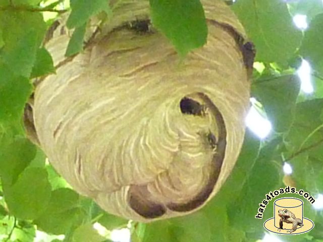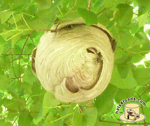 Bald faced hornets (which are actually a yellowjacket) build basketball size nests in trees and frequently go completely undetected until the leaves fall off the trees. They don't get into food the way the eastern yellow jackets do.